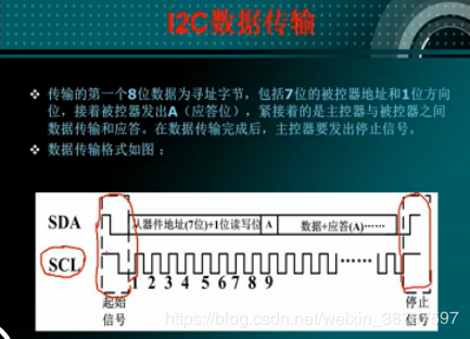 中间为数据传输:每发8位的有效数据之后要对方来一个应答位。上图中A表示应答。