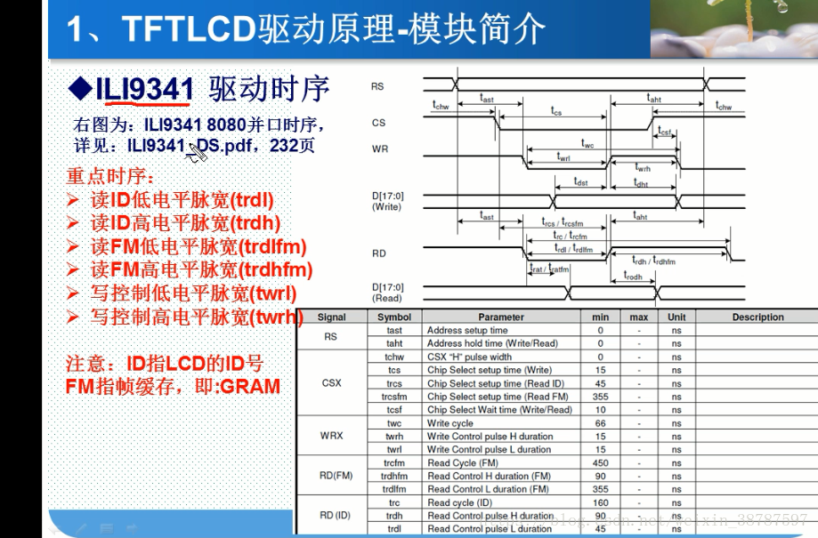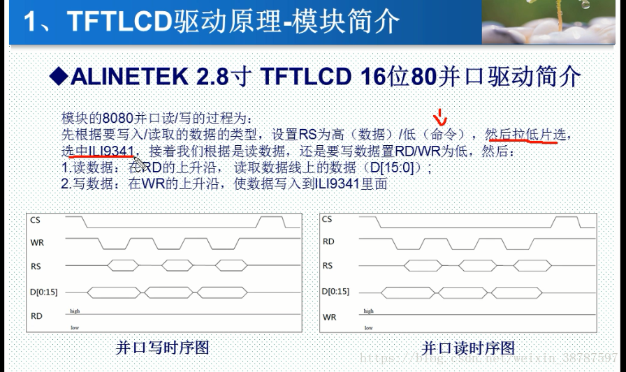 这其中NBL是用不到的。A只用到了一个,最重要的还是看最下面这个D信号的时序,它对应我们的ILI9341的读写时序。