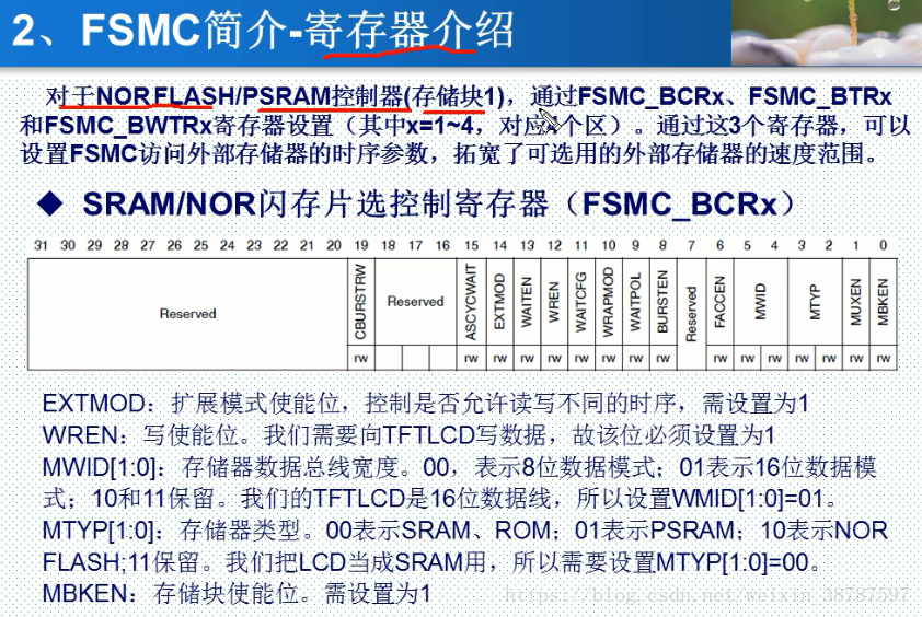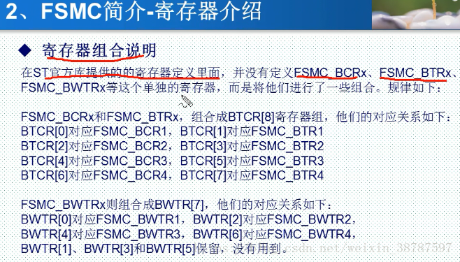 FSMC_BCRx 这个寄存器,x代表1-4,对应我们的前面的第一个区到第四个区。