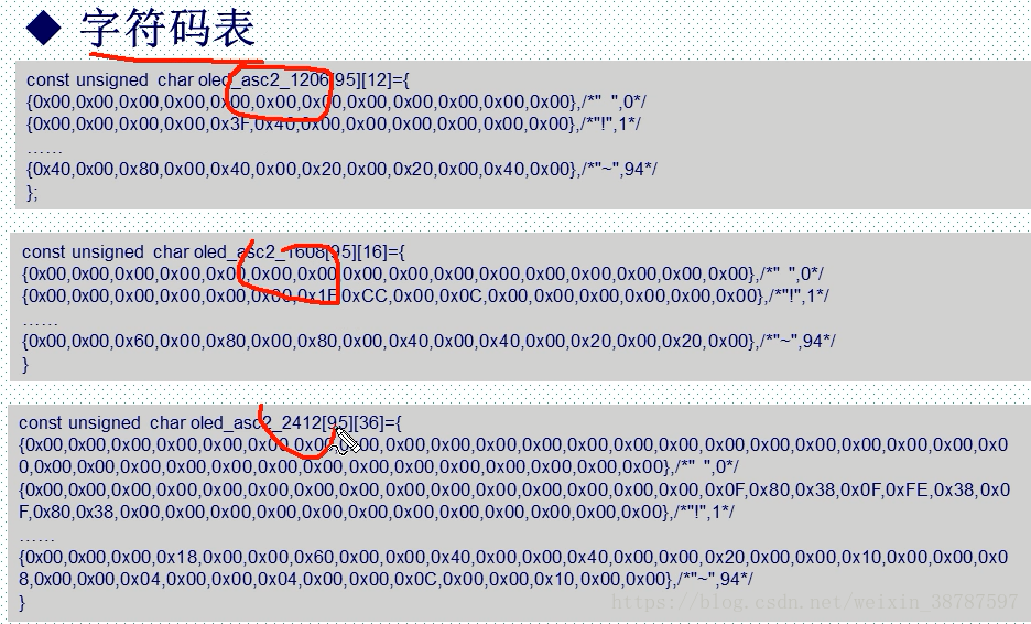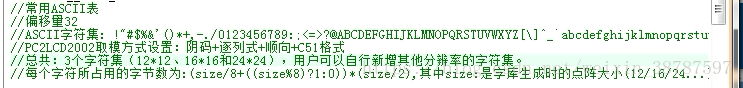 ASCII的字符 高度=宽度的一倍 例如:asc2_2412[95][36] 就是竖向的(字符高为24)那么字符宽就=12。那么这个字符共有3x8=24 也会是高度占3个字节,宽度=24/2=12 高度的字节数x宽度=3x12=36个字节。95代表这个数组中有95个字符。