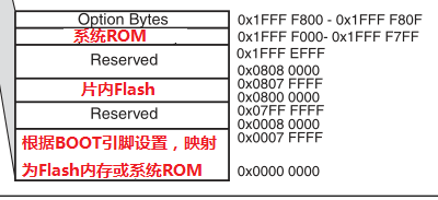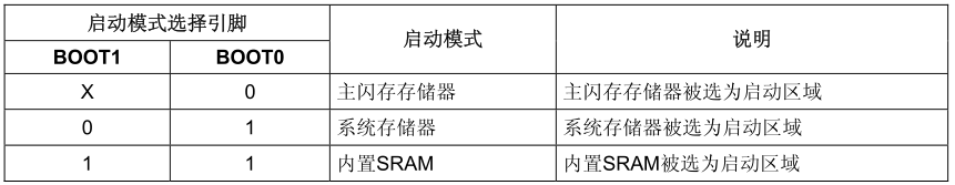 该芯片可以通过设置BOOT0和BOOT1两个引脚,选择不同的启动方式,正常情况下BOOT0=0,BOOT1=0(0为低电平)。即,芯片将从Flash中加载代码启动。