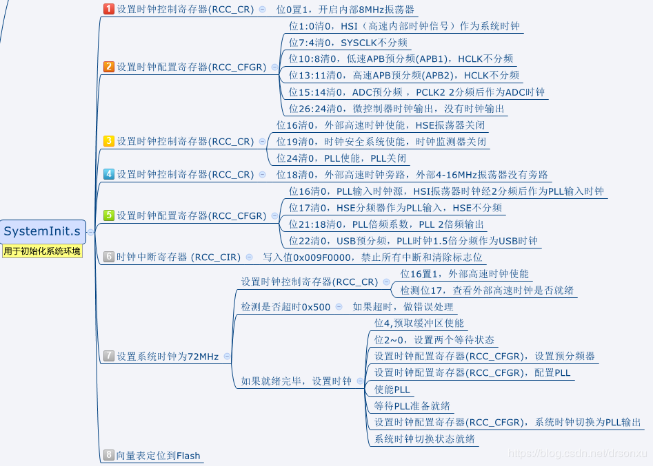 主要是配置芯片的时钟,禁止所有中断,设置向量表位置。如图: