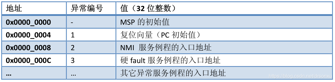 当发生了异常并且要响应它时,CM3 需要定位其处理例程的入口地址。这些入口地址存储在所谓的“(异常)向量表”中。缺省情况下,CM3 认为该表位于零地址处,且各向量占用 4 字节,因此每个表项占用 4 字节。如图:
