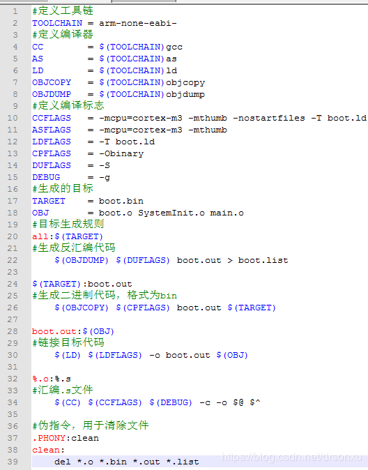 本章到此结束,主要是简单介绍了该芯片的启动模式设置,启动流程。stm32F103的初始化没有什么复杂的设置,可以通过相关文档手册,了解向量表的内容;或参照STM32固件库v3.5的源代码。有关链接脚本,Makefile的知识,在本系列博客中不会讲解,网上有相关的资料文档。