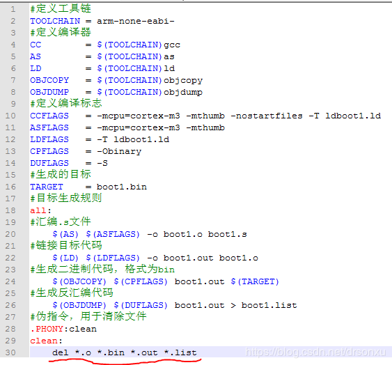 3.创建文件Makefile,这是编译用的工程文件,用于编译boot1.s文件。划红线的地方与在linux系统中有所不同。Makefile教程,可以网上搜索或阅读Makefile文档。代码如下: