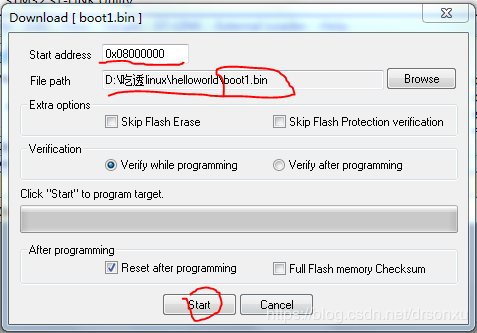 10.下载bin文件到单片机,点击Target->Program & Verify,出现如下图的对话框。注意start address为0x08000000,即为flash的地址。确认File path是否是需要下载的文件。点击Start按钮。