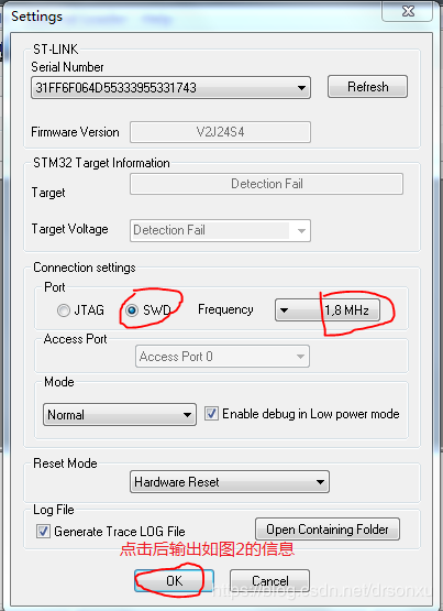 9.打开ST-Link Utility软件,点击设置按钮具体设置如图1,连接单片机(单片机与电脑需要连接好和驱动需要安装好,打开单片机电源)。点击ok按钮后,如图2所示的信息。