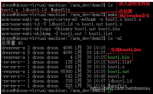 6.通过WinSCP软件,将上述的三个文件放到ubuntu系统中。在ubuntu系统中,进入这些文件所在的位置,输入make命令,将会生成.bin文件。