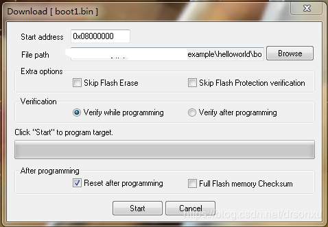 9.下载bin文件到单片机,点击Target->Program & Verify,出现如下图的对话框。注意start address为0x08000000,即为flash的地址。确认File path是否是需要下载的文件。点击Start按钮。