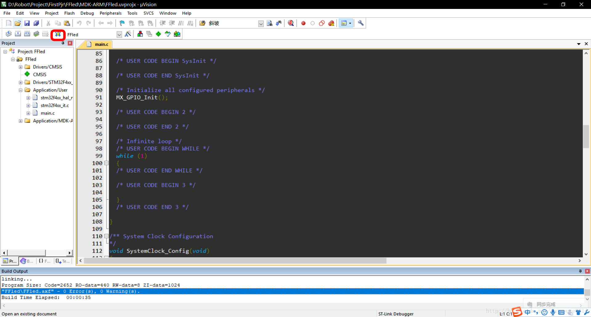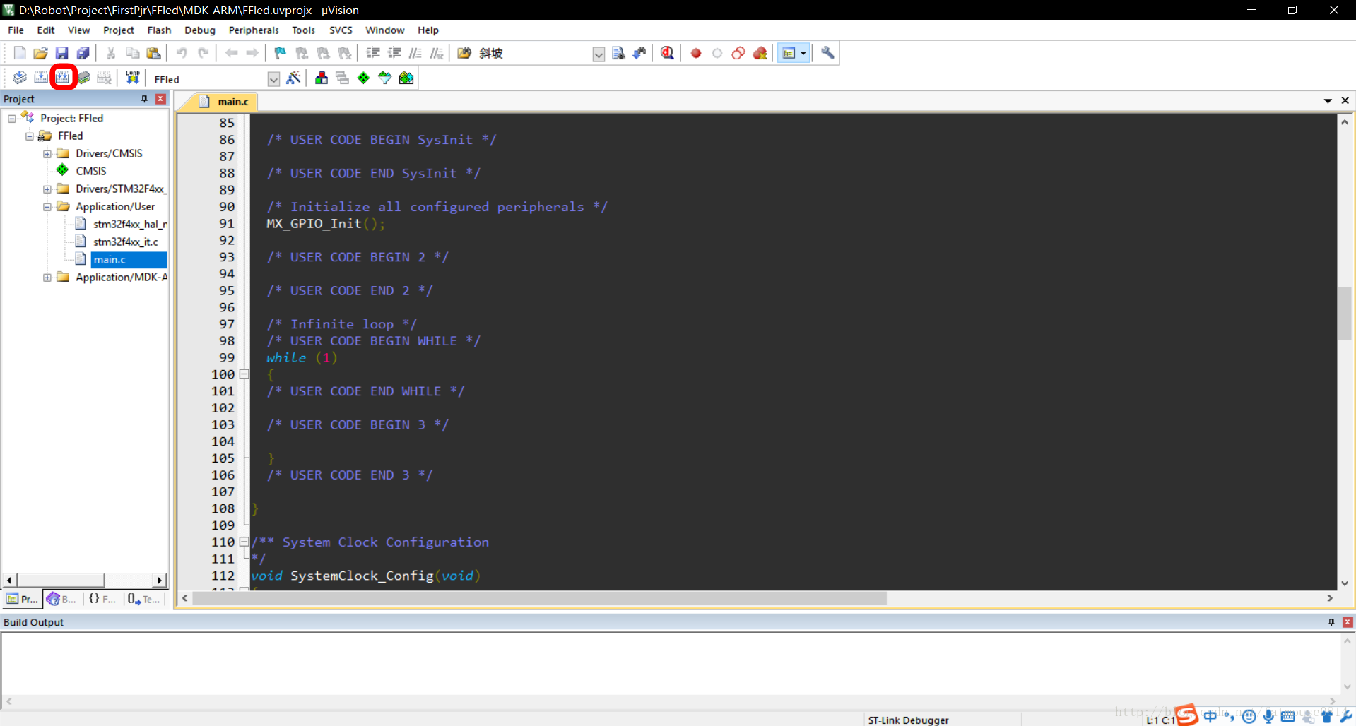 ②通过Keil 5 Rebuild和Download,单片机就可以点亮Led了。