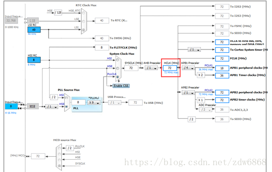 时钟配置采用图形配置,直观简单。各个外设时钟一目了然。STM32最高时钟为72M,此处只有在HCLK处输入72,软件即可自动配置。(RCC选择外部高速时钟)。