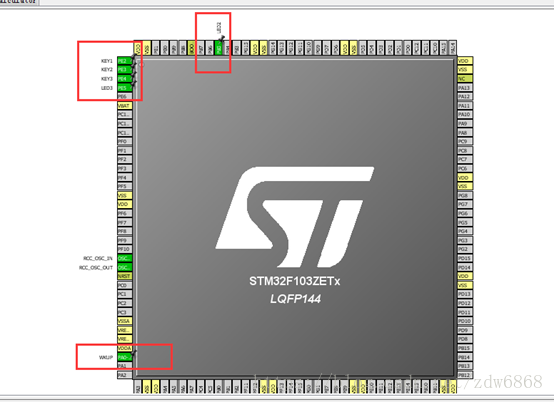 GPIO口功能选择,PB5、PE5为LED2、LED3.找到对应管脚设置为GPIO_Output模式。(黄色引脚为该功能的GPIO已被用作其他功能,可以忽略。绿色表示管脚已使用)