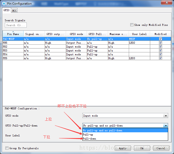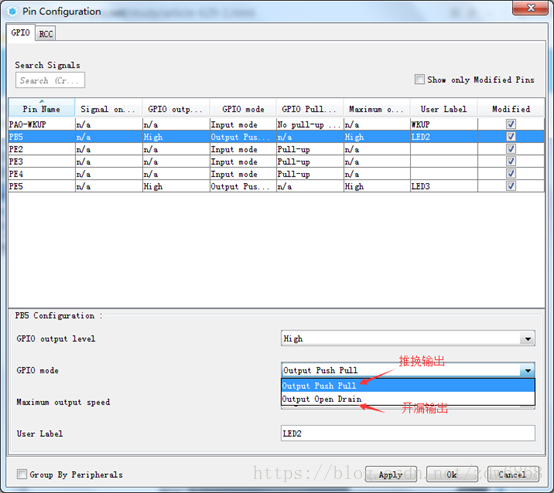 PA0、PE2、PE3、PE4为按键输入管脚,选择GPIO_OUTPUT模式。