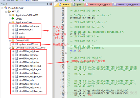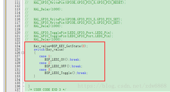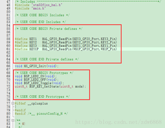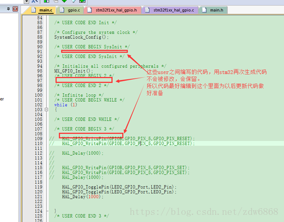 (用户代码要加在USER CODE BEGIN N和USER CODE END N之间,否则下次重新生成代码后,会被删除)