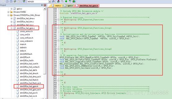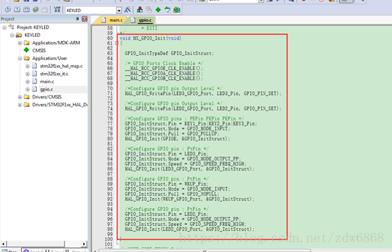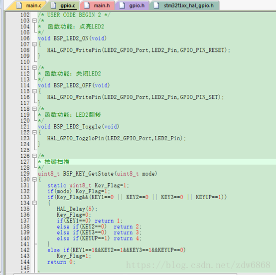 在gpio.c文件中可以看到LED和KEY管脚的初始化函数。