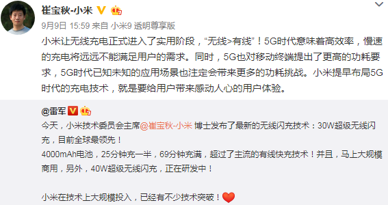 2019年09月11日 | 小米高管谈30W无线充电意义:意味它将进入实用阶段