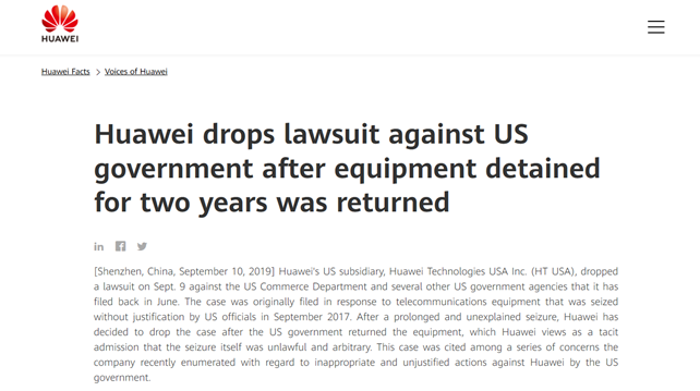 2019年09月11日 | 非法扣押2年货物被退回 ! 华为:打算撤销诉讼!