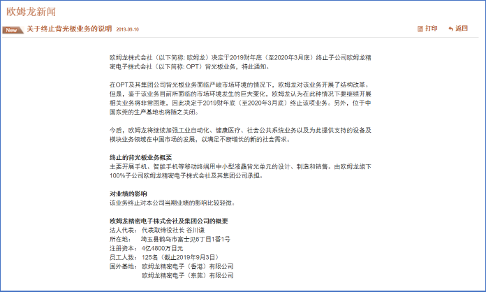 该通知表示,在OPT及其集团公司背光板业务面临严峻市场环境的情况下,欧姆龙对该业务开展了结构改革。但是,鉴于该业务目前所面临的市场环境发生的巨大变化,欧姆龙认为在此种情况下要继续开展相关业务将非常困难,因此决定于2019财年底(至2020年3月底)终止该项业务。另外,位于中国东莞的生产基地也将随之关闭。
