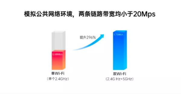 根据测试,在模拟的公共网络环境下,采用两条链路带宽均小于20Mps的网络,双Wi-Fi(2.4GHz+5GHz)的下载速率比单WiFi(单个2.4GHz)的爱奇艺缓存测试速度提升了296%,抖音载入速度提升了74.4%,网页的加载速度提升了44.5%。