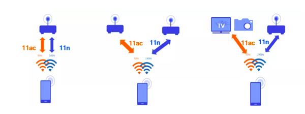 普通手机在同一时间只能连接一个AP的一个Wi-Fi频段(2.4GHz或5GHz)来获取Wi-Fi信号,而搭载高通实时双频Wi-Fi技术的手机可以连接到两个不同AP的两个频段(通过其中一个AP的2.4GHz和另一个AP的5GHz来连接),能够为用户提供更高速率、更低延时和更稳定的Wi-Fi网络——也就是说,可以用一部手机连接到两个路由器的网络。