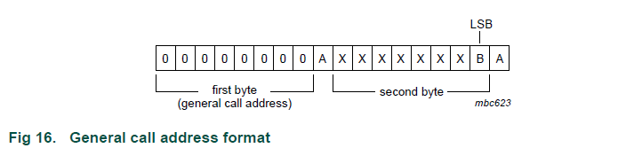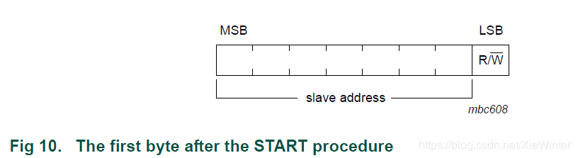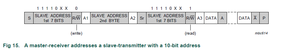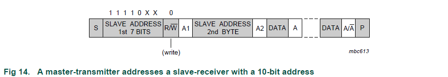 第一个字节的前七位是组合1111 0XX,其中最后两位(XX)是10位地址的两个最高有效位(MSB); 第一个字节的第八位是决定消息方向的R / W位。