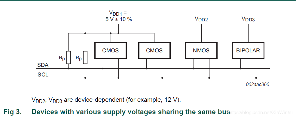 SDA和SCL都是双向线路,通过电流源或上拉电阻连接到正电源电压(见图3)。 当总线空闲时,两条线都是HIGH。 连接到总线的器件的输出级必须具有漏极开路或开路集电极,以执行线与功能。 I2C总线上的数据可以在标准模式下以高达100 kbit / s的速率传输,在快速模式下最高可达400 kbit / s,在快速+模式下最高可达1 Mbit / s或以上 在高速模式下为3.4 Mbit / s。 总线电容限制了连接到总线的接口数量。