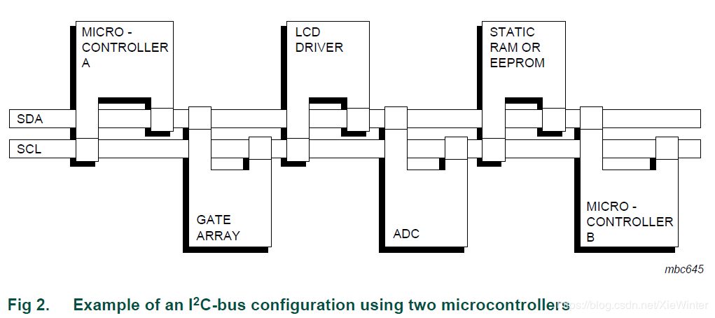 只要求两条总线线路:一条串行数据线(serial data line ,SDA),一条串行时钟线(serial clock line , SCL)