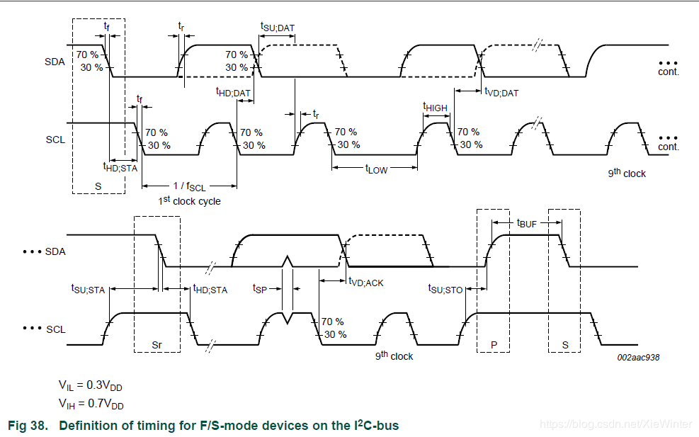 由于可以连接到I2C总线的各种不同技术设备(CMOS,NMOS,双极),逻辑“0”(低)和“1”(高)的电平不固定,取决于 相关的VDD电平。 输入参考电平设置为VDD的30%和70%; VIL为0.3VDD,VIH为0.7VDD。 请参见图38,时序图。 一些传统器件输入电平固定为VIL = 1.5 V和VIH = 3.0 V,但所有新器件都需要30%/ 70%的规格。