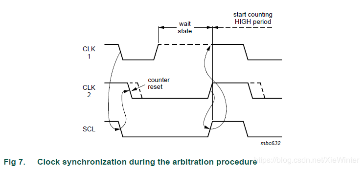 当所有有关的器件数完了它们的低电平周期后,时钟线被释放并变成高电平。之后器件时钟和SCL线的状态没有差别。而且所有器件会开始数它们的高电平周期。首先完成高电平周期的器件会再次将SCL线拉低。
