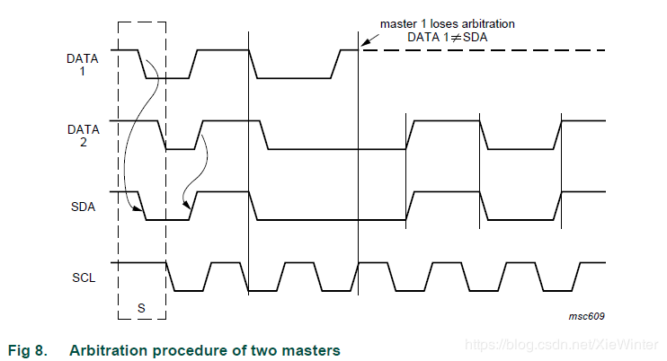 当SCL 线是高电平时,仲裁在SDA 线发生;这样,在其他主机发送低电平时,发送高电平的主机将断开它的数据输出级,因为总线上的电平与它自己的电平不相同。