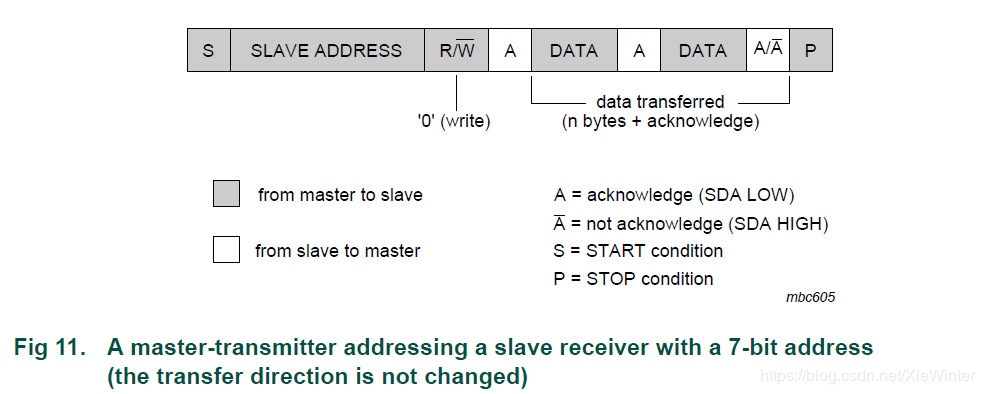 主发送器发送到从接收器。 传输方向没有改变(见图11)。 从接收器确认每个字节。