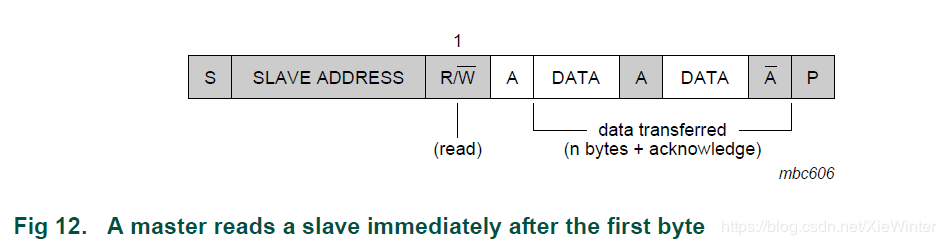 主机在第一个字节后立即读取从机(参见图12)。 在第一次确认时,主发送器变为主接收器,从接收器变为从发送器。 第一次确认仍由从机生成。 主设备生成后续确认。 STOP条件由主机产生,它在STOP条件之前发送一个非应答(A)。