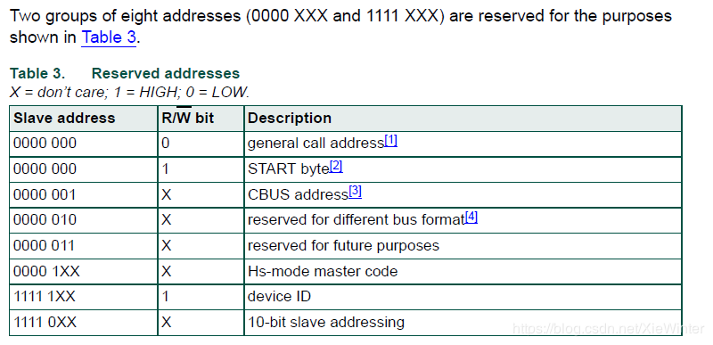 尽管保留地址位1111XXX有八种可能的组合,但只有四种组合1111 0XX用于10位寻址。 其余四种组合1111 1XX保留用于未来的I2C总线增强。
