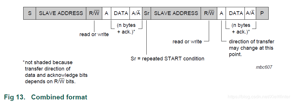 组合格式(见图13)。 在传输改变方向时候,START条件和从地址都重复,但R / W位反转。 如果主接收器发送重复START条件,它会在重复START条件之前发送一个非应答(A)