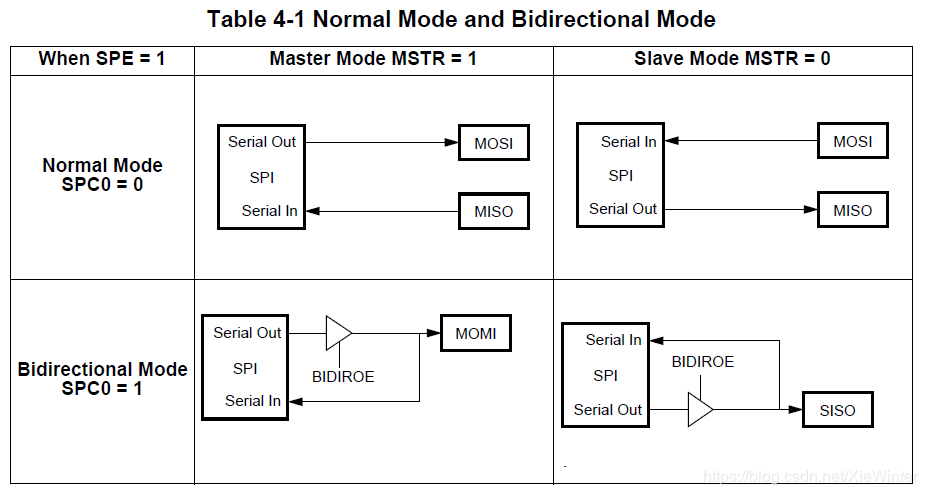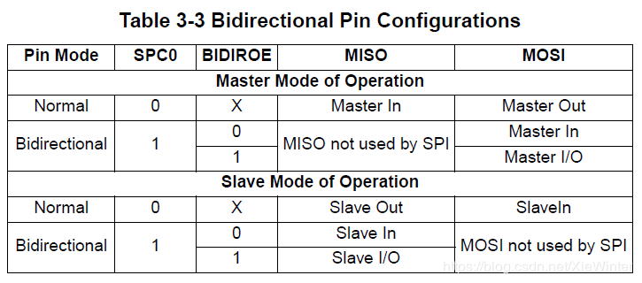 当SPI控制寄存器2中的SPC0位置1时,选择双向模式(见表4-1正常模式和双向模式)。 在此模式下,SPI仅使用一个串行数据引脚作为与外部器件的接口。 MSTR位决定使用哪个引脚。 MOSI引脚成为主模式的串行数据I / O(MOMI,Master Output, Master Input)引脚,MISO引脚成为从模式的串行数据I / O(SISO)引脚。 SPI不使用主模式下的MISO引脚和从模式下的MOSI引脚。