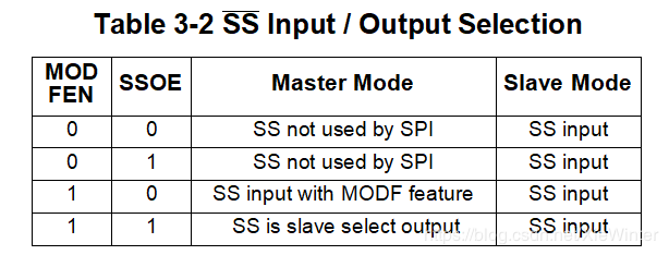 通过置位SSOE和MODFEN位,SS输出仅在主模式下在正常SPI操作期间可用,如表3-2所示。