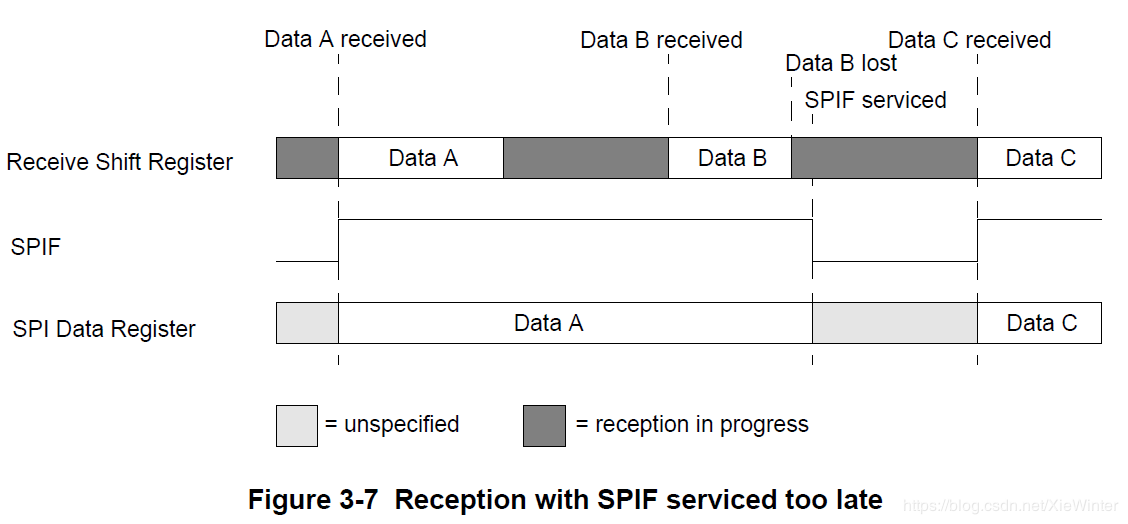 如果SPIF置1且接收移位寄存器中有效字节,并且在第三次发送开始后SPIF服务,则接收移位寄存器中的字节无效并且不会传输到SPIDR中(see Figure 3-7 Reception with SPIF serviced too late)