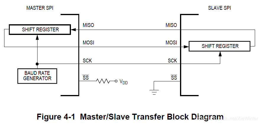 图1-1给出了SPI架构的概述。 SPI的主要部分是状态,控制和数据寄存器,移位器逻辑,波特率发生器,主/从控制逻辑和端口控制逻辑。