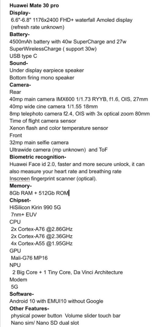 近日,有国外网友曝光华为Mate 30 Pro的配置详单,基本上和传闻中的没有大差别。