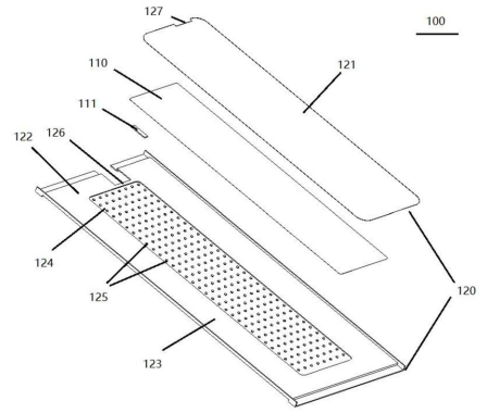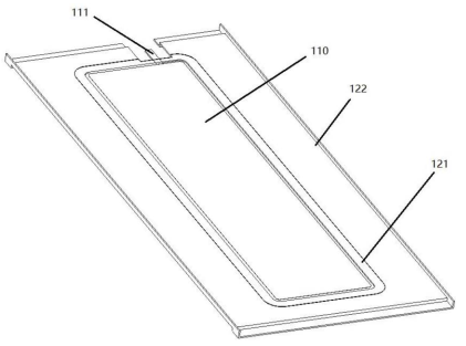 上图是该散热构件100的结构示意图,散热构件100为均热板,它主要包括散热模块110及导热壳体120,其中散热模块110与导热壳体120相耦合。