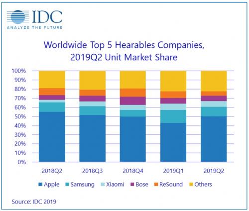 IDC统计显示,苹果的耳戴式设备在市场上仍居于领先地位、2019年第2季市占率达50.2%, 低于一年前的55.2%。 新产品(更新的AirPods和最新的Beats系列产品)让这家公司出货量年增218.2%。