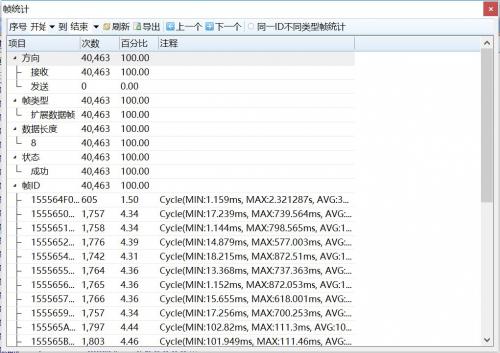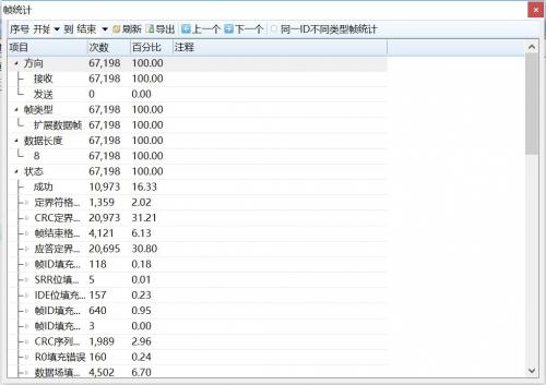 前段时间有个做模台流水线的用户,一条流水线有两路CAN总线,一条总线有22个控制节点,每当启动模台就会出现严重的失控状态,模台下是由很多电机驱动的,而操控台下放着变频器。使用CANScope测试发现,在未启动电机情况下,控制台的CAN通信正常,帧统计结果显示100%成功率,如图1所示。