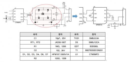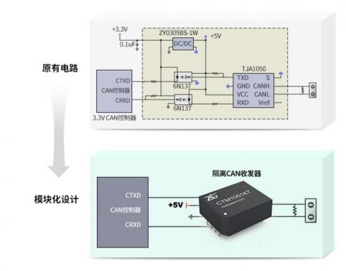 传统用户都采用分立器件自己搭建隔离电路的方式,如今大家更青睐使用隔离收发器做防护隔离。如图6所示的CTM系列隔离收发器的总线隔离技术,与传统分立器件方案相比,产品具备更高的集成度与可靠性,能够有效提升总线通信防护等级,极大程度降低用户的采购与生产成本,大幅缩短开发周期。