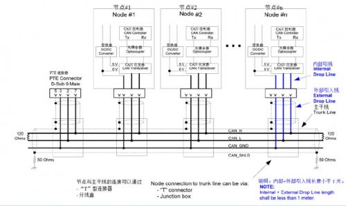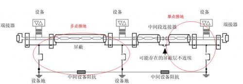 在CAN的应用场合,由于距离一般都较远,所以大部分采用屏蔽层单点接地的原则,在干线上找一点将屏蔽层用导线直接接地,该点应是所受干扰最小的点,同时该点位于网络中心附近。