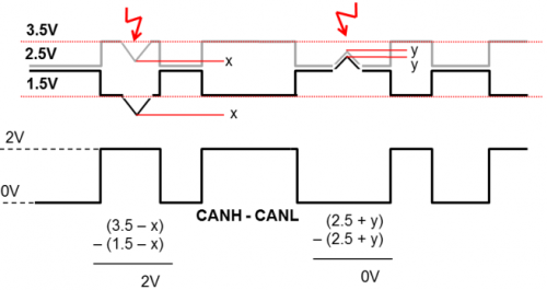 CAN总线为了提高抗干扰能力,采用CANH和CANL差分传输,达到效果就是遇到干扰后,可以“同上同下”,最后CANH-CANL的差分值保持不变。如图13所示。