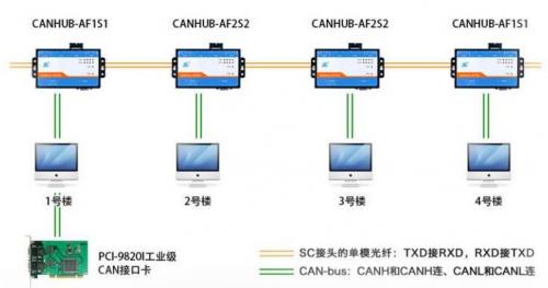 增加CAN转光纤转换器。解决超强干扰(比如远程激光与电磁脉冲发射装置)与雷击问题,光纤是一种无法被电磁干扰的传输介质,如图15所示,为使用ZLG致远电子的CANHub-AF1S1和CANHub-AF2S2组合的光纤主干网络。