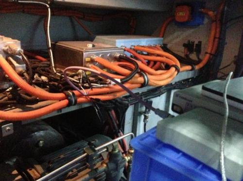 远离干扰源是最简单的抗干扰方法,如果CAN线与强电干扰源远离0.5米,干扰就基本影响不到了。可是在实际布线中,经常遇到空间太小而不得不和强电混在一起,如图16所示,为某新能源汽车的驱动系统,CAN线与驱动线混在一起,结果导致干扰很大。只要与CAN并行的驱动线,具备2A/秒的电流变化,就会耦合出强磁场而导致CAN线上出现干扰脉冲。所以CAN线必须要和电流会剧烈变化的线缆远离。比如继电器、电磁阀、逆变器、电机驱动线等。