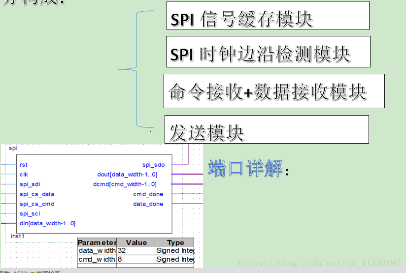 主要由SPI信号缓存模块,SPI时钟边沿检测,命令接收+数据接收,发送几部分构成: