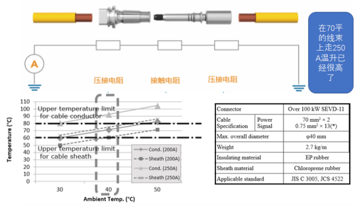 我们实际在设计考虑中,整个温度连接点是需要控制在100度以下的,主要原因是超过一个温度,会使得导体防腐蚀的镀层不稳定。类似下面充电线缆和连接器由于接触电阻和压接电阻引起温升的问题,会在我们上述电池内部也出现。如果出现在电池连接处,会对电池产生很大的影响。