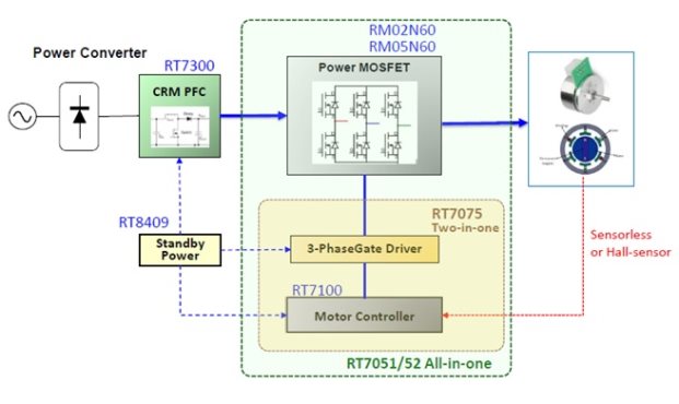 Richtek为市场提供的直流无刷电机驱动解决方案由电机控制器、门极驱动器、功率元件等产品以及由电机控制器和门极驱动器集成在一起的二合一产品和将电机控制器、门极驱动器及功率元件都集成在一起的三合一产品组合而成。组成完整的电机控制系统所需要的PFC控制器、电源转换器等产品也都齐备,因而可以满足用户在应用上的所有需求。